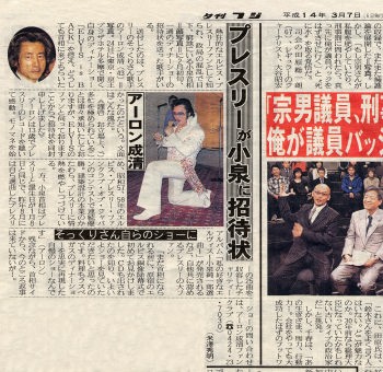 熱狂的なエルビス・プレスリーファンとして知られ、政局の混乱で目下、窮地にいる小泉首相=写真左=に2月初旬、一通のディナーショーの招待状を送った歌手がいる。 送付したのは、プレスリーのそっくりさん歌手のアーロン成清(43)24日に東京・京王プラザホテル多摩で開く自身のディナーショー「ELVIS is BACK」を控え、どうしても首相に来て、もらいたかったのだという。文面はこんな風だ。