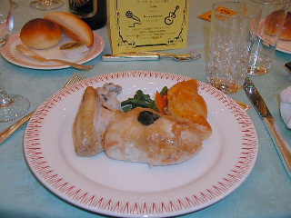 | ヤングチキンの胸肉、スヴァロア風 鶏君もまだ若いのに・・・かわいそうだなと思いつつ食った。ソースはないのかな?と思いつつお塩を探したが、なくて塩味が欲しく、1/3食べたところでソースがでてきたのであった。だけどこの「風」とはなんだろうか?スヴァロア地方の名物料理つうのかな?食い物もインパソなのだなと、妙に納得したね。 |